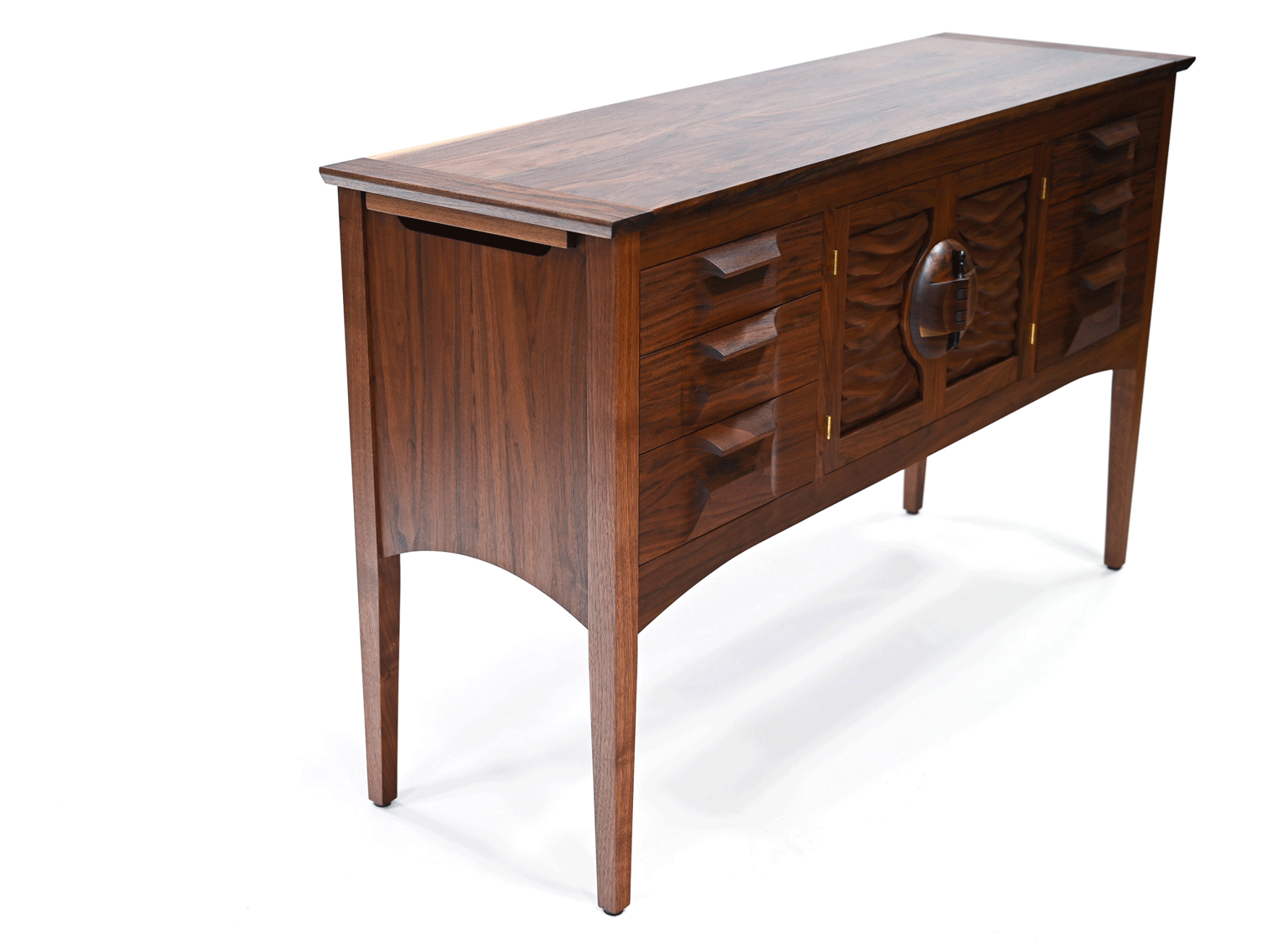 The Six outer drawers feature Dovetail construction with curly maple drawer sides and sculpted drawer fronts.